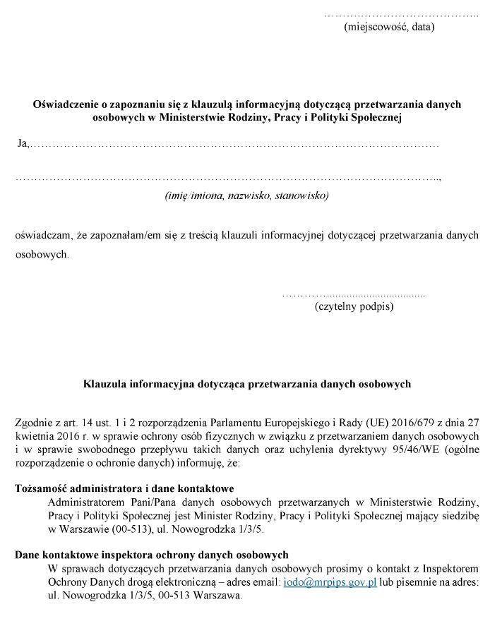 WZÓR - OŚWIADCZENIE O ZAPOZNANIU SIĘ Z KLAUZULĄ INFORMACYJNĄ DOTYCZĄCĄ PRZETWARZANIA DANYCH OSOBOWYCH W MINISTERSTWIE RODZINY, PRACY I POLITYKI SPOŁECZNEJ