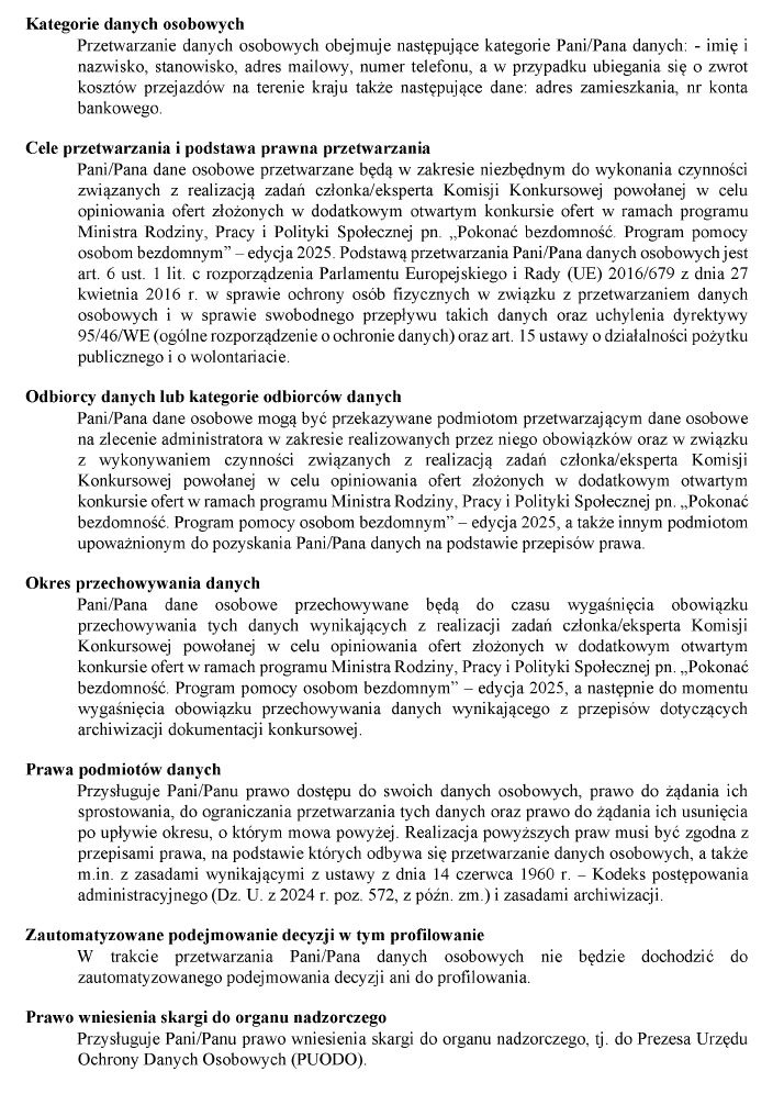 § 1. Powołuje się Komisję Konkursową w celu opiniowania ofert złożonych w dodatkowym otwartym konkursie ofert w ramach programu Ministra Rodziny, Pracy i Polityki Społecznej pn. „Pokonać bezdomność. Program pomocy osobom bezdomnym” - edycja 2025, zwaną dalej „Komisją”.