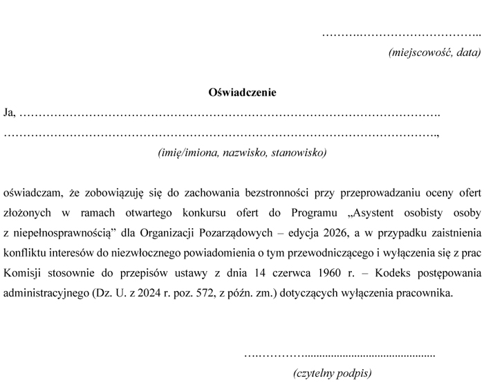 § 1. Powołuje się Komisję Konkursową, zwaną dalej „Komisją”, w celu przeprowadzenia otwartego konkursu ofert i dokonania wyboru najkorzystniejszych ofert w ramach realizacji Programu „Asystent osobisty osoby z niepełnosprawnością" dla Organizacji Pozarządowych edycja 2026, zwanego dalej „Programem”, finansowanego ze środków Funduszu Solidarnościowego, zwanego dalej „Funduszem”.