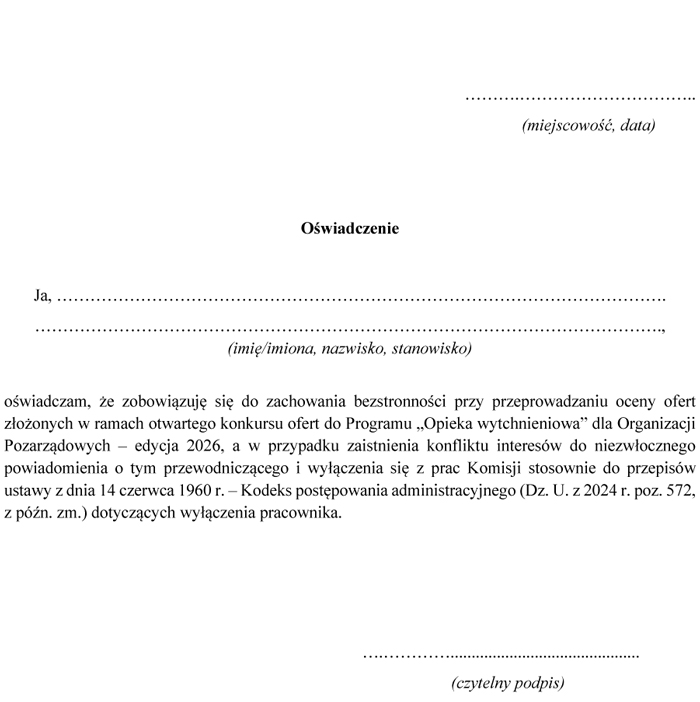 § 1. Powołuje się Komisję Konkursową, zwaną dalej „Komisją”, w celu przeprowadzenia otwartego konkursu ofert i dokonania wyboru najkorzystniejszych ofert w ramach realizacji Programu „Opieka wytchnieniowa" dla Organizacji Pozarządowych – edycja 2026, zwanego dalej „Programem”, finansowanego ze środków Funduszu Solidarnościowego, zwanego dalej „Funduszem”.