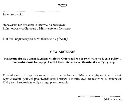 WZÓR - OŚWIADCZENIE O ZAPOZNANIU SIĘ Z ZARZĄDZENIEM MINISTRA CYFRYZACJI W SPRAWIE WPROWADZENIA POLITYKI PRZECIWDZIAŁANIA KORUPCJI I KONFLIKTOWI INTERESÓW W MINISTERSTWIE CYFRYZACJI