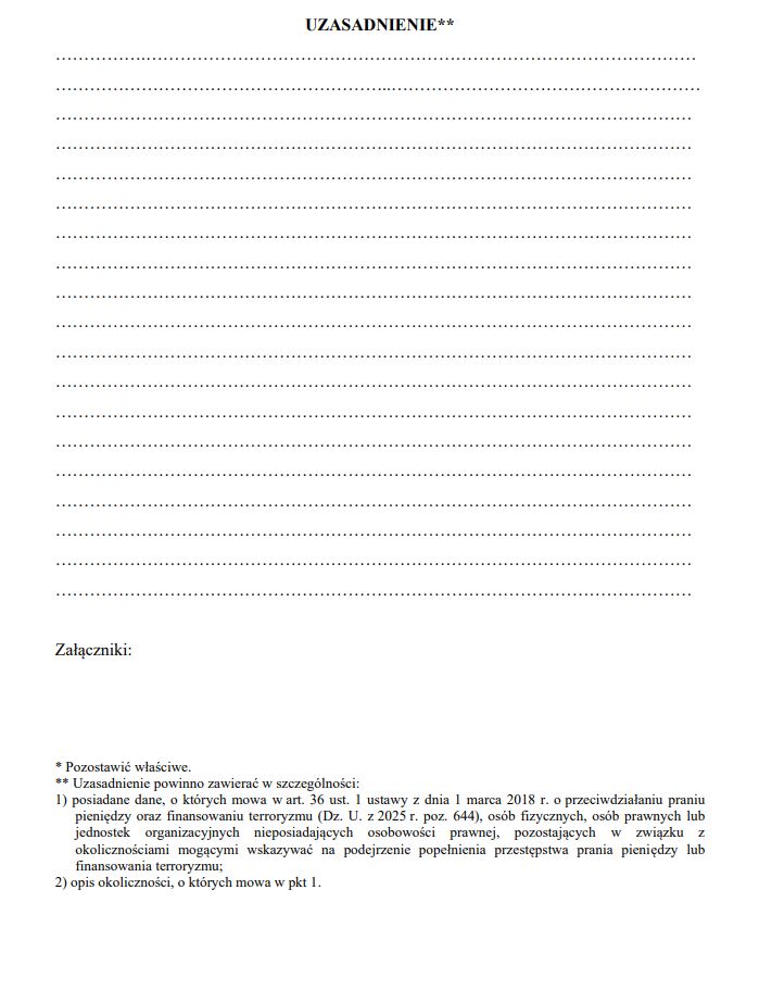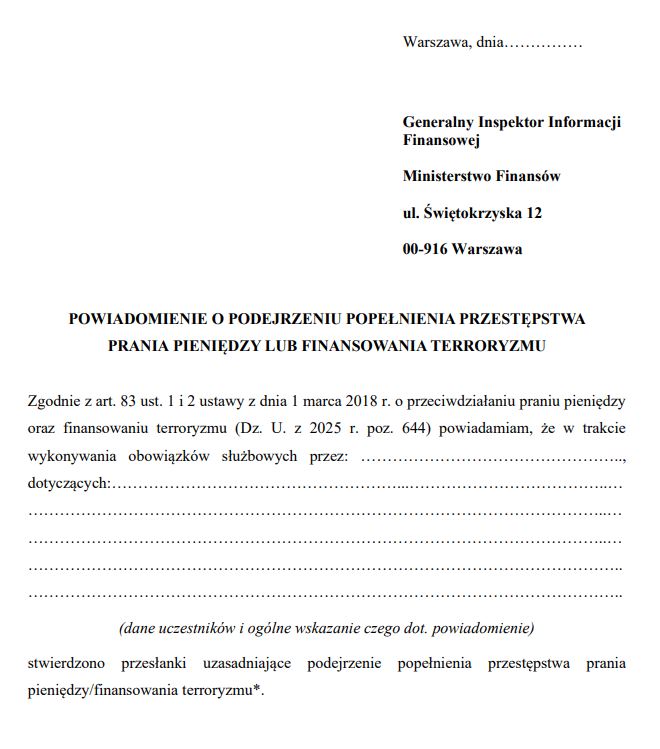 WZÓR - POWIADOMIENIE O PODEJRZENIU POPEŁNIENIA PRZESTĘPSTWA PRANIA PIENIĘDZY LUB FINANSOWANIA TERRORYZMU