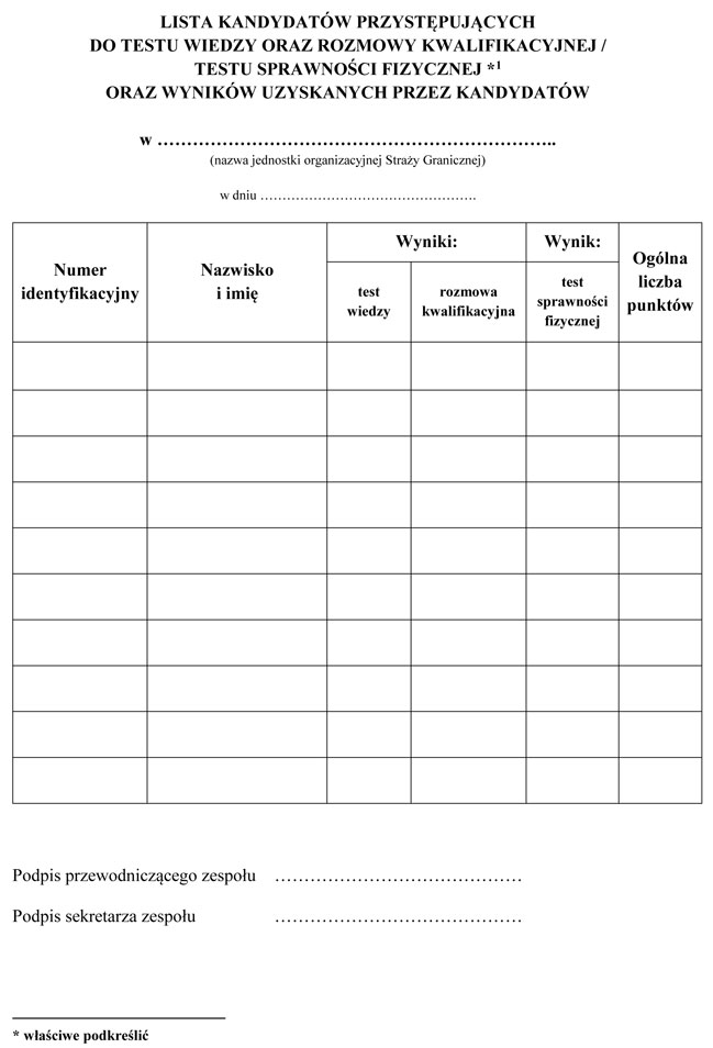 1) sporządza listę kandydatów przystępujących do testu wiedzy zawierającą dane personalne wraz z numerami identyfikacyjnymi kandydatów oraz uzyskane przez nich wyniki. Wzór listy kandydatów przystępujących do testu wiedzy oraz rozmowy kwalifikacyjnej/testu sprawności fizycznej oraz wyników uzyskanych przez kandydatów, stanowi załącznik do decyzji;