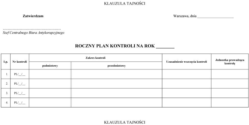 § 6. 1. Roczny plan kontroli, o którym mowa w art. 32 ust. 1 ustawy, sporządzany jest przez Departament Postępowań Kontrolnych w terminie do dnia 31 stycznia każdego roku, według wzoru określonego w załączniku do zarządzenia.