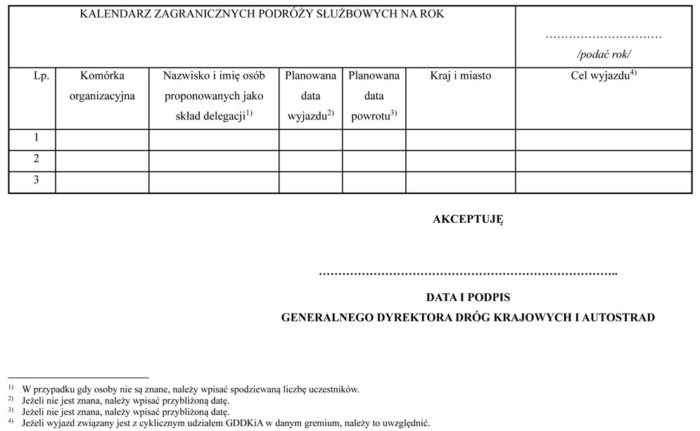 § 3. 1. Zagraniczne podróże służbowe odbywają się zgodnie z kalendarzem zagranicznych podróży służbowych, zwanym dalej „kalendarzem”, ustalanym na rok, w którym planuje się zagraniczną podróż służbową, którego wzór stanowi załącznik nr 2 do zarządzenia.