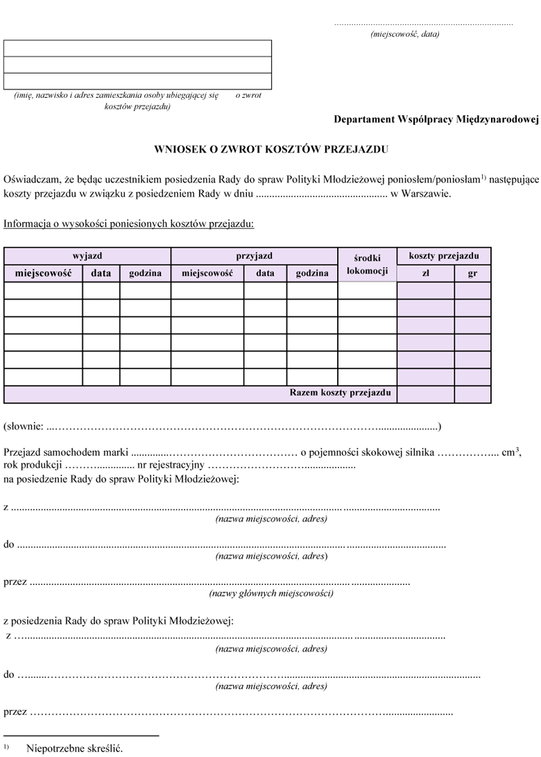 WNIOSEK O ZWROT KOSZTÓW PRZEJAZDU