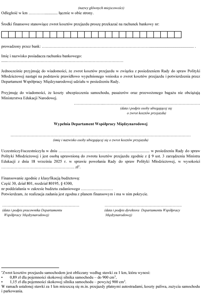 4. Zwrot kosztów przejazdu, o którym mowa w ust. 3, następuje na podstawie wniosku, złożonego w terminie 7 dni od dnia posiedzenia Rady. Do wniosku dołącza się dokument potwierdzający poniesione wydatki, w szczególności rachunek, fakturę lub bilet, a w szczególnie uzasadnionych przypadkach - oświadczenie o wysokości poniesionych kosztów przejazdu samochodem wskazanych we wniosku.
