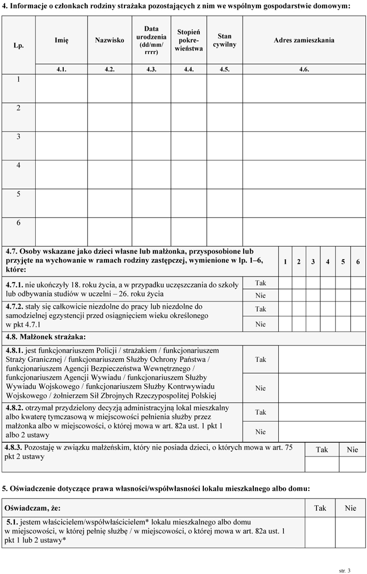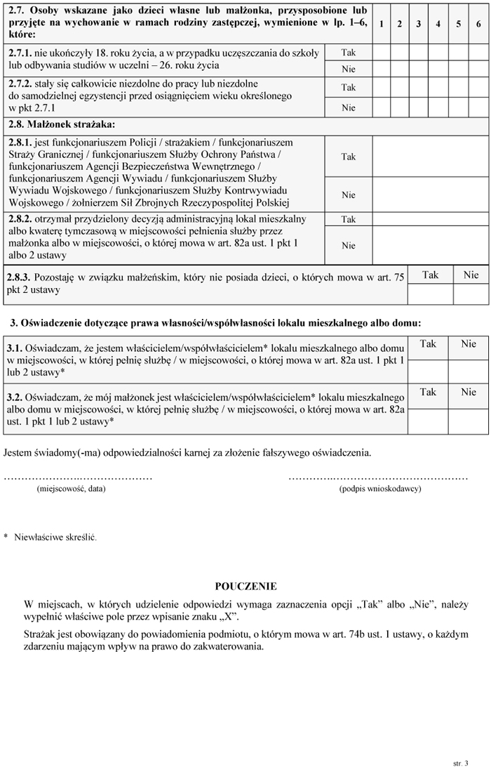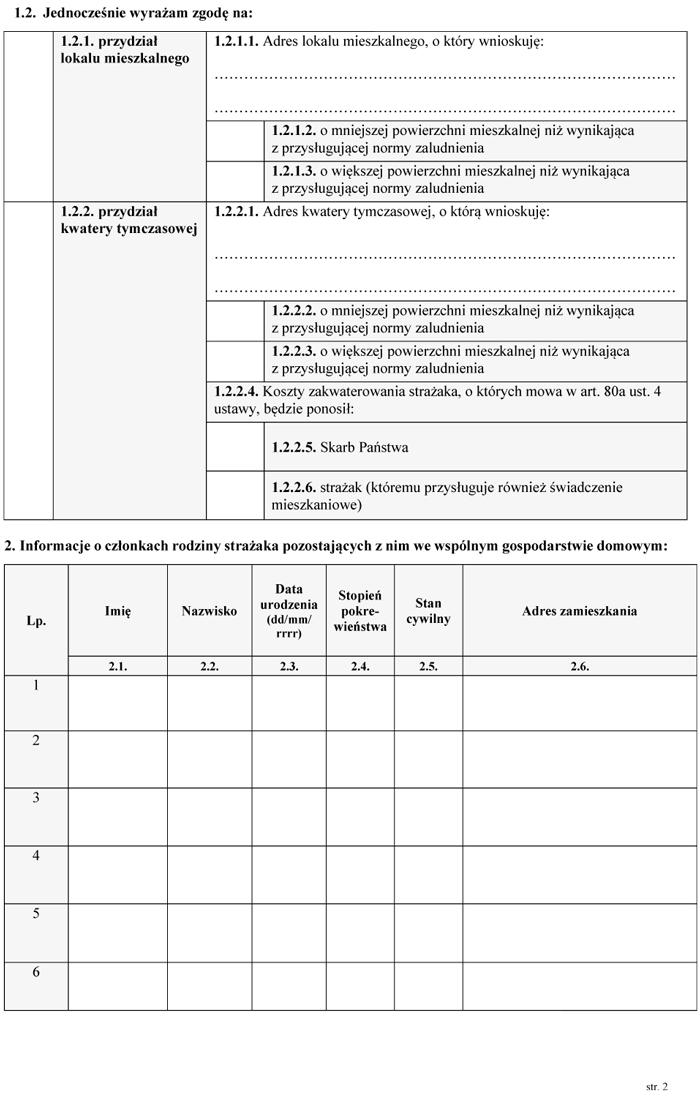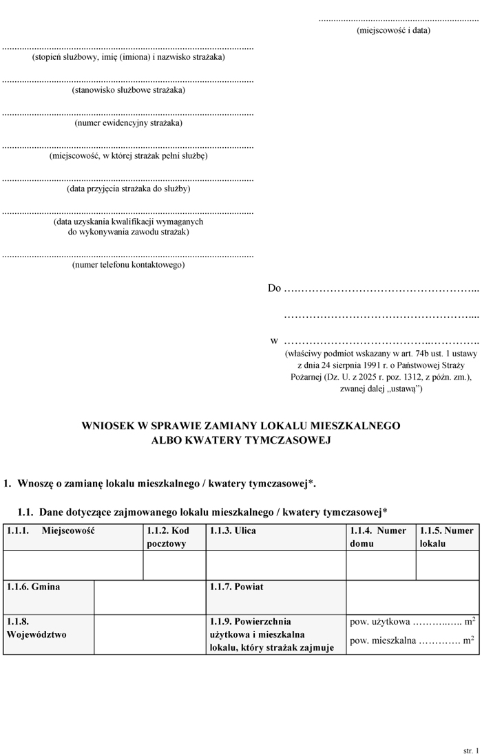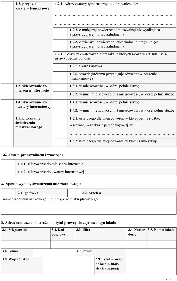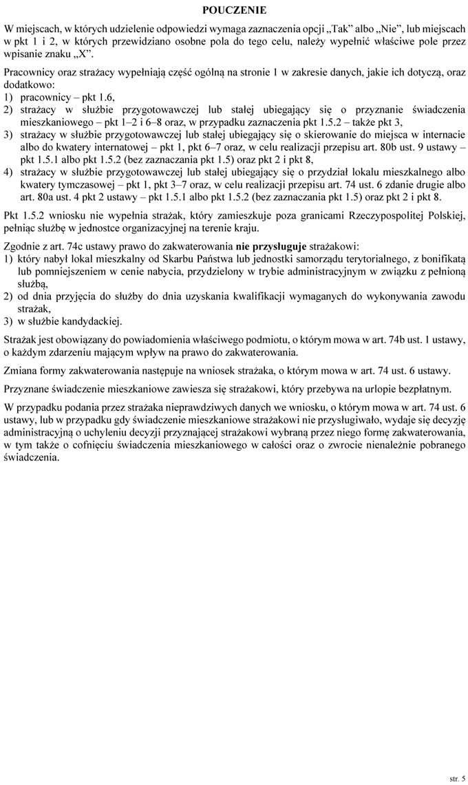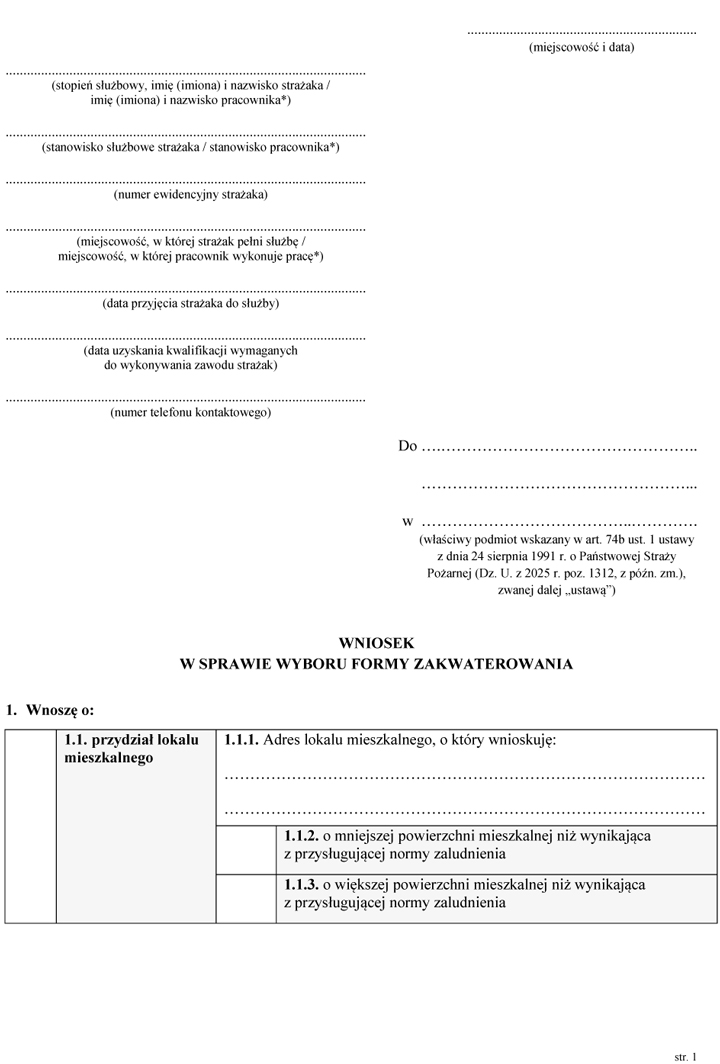 1) wzór wniosku w sprawie wyboru formy zakwaterowania, o którym mowa w art. 74 ust. 6 ustawy z dnia 24 sierpnia 1991 r. o Państwowej Straży Pożarnej, zwanej dalej „ustawą”;