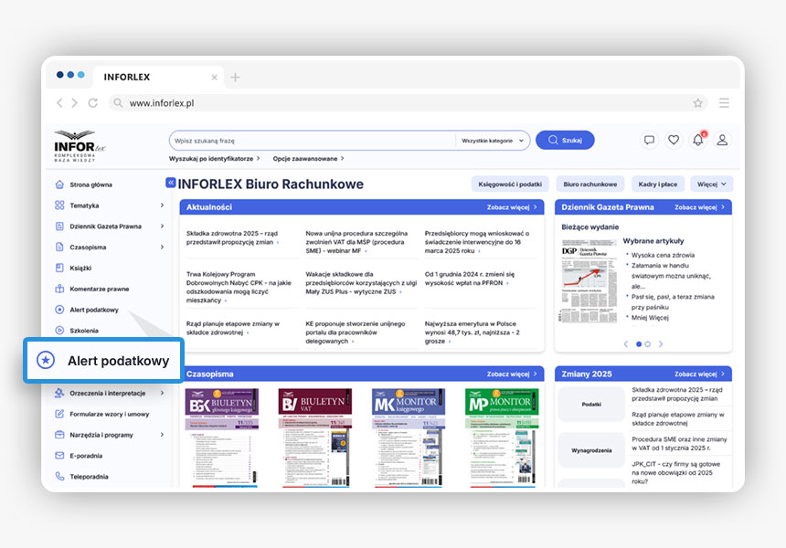 Alert podatkowy jest dostępny w produkcie INFORLEX Biuro Rachunkowe w lewym menu. Można w niego wejść z poziomu menu głównego lub ze strefy tematycznej Biuro Rachunkowe.