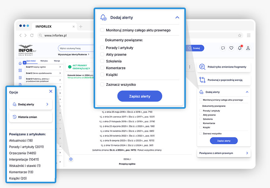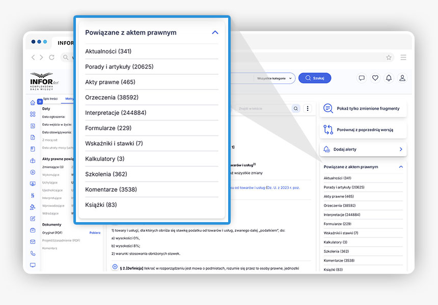 Po wejściu w treść aktu prawnego po prawej stronie pod przyciskiem Powiązane z aktem prawnym można wyświetlić wszystkie kategorie dokumentów powiązanych z tym aktem prawnym.