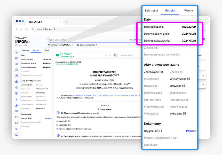 Po lewej stronie znajduje się metryka – podstawowe informacje o akcie prawnym – kiedy został on opublikowany, od kiedy obowiązuje.
