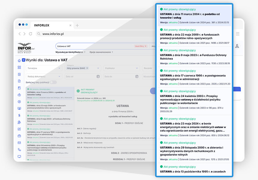 Dzięki tej funkcjonalności możemy prześledzić wszystkie zmiany aktu prawnego. Możemy wyświetlić taką wersję, jakiej potrzebujemy, ewentualnie możemy wpisać konkretną datę. Obecnie obowiązująca wersja jest oznaczona kolorem zielonym, wersje przyszłościowe – kolorem niebieskim, natomiast wersje archiwalne – kolorem czarnym.