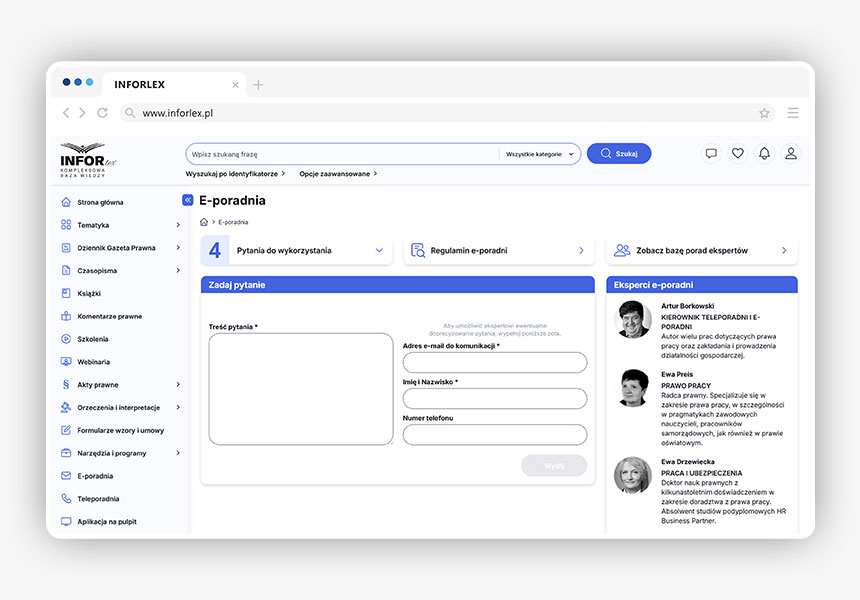 Po kliknięciu w przycisk E-poradnia, znajdujący się w lewym menu lub w boksie PORADNICTWO na stronie głównej wyświetli się formularz do zadawania pytań.
