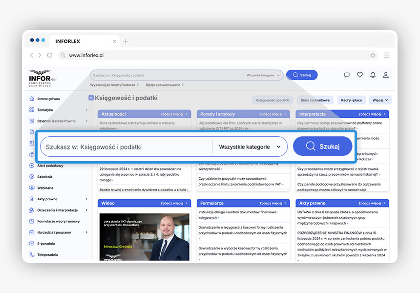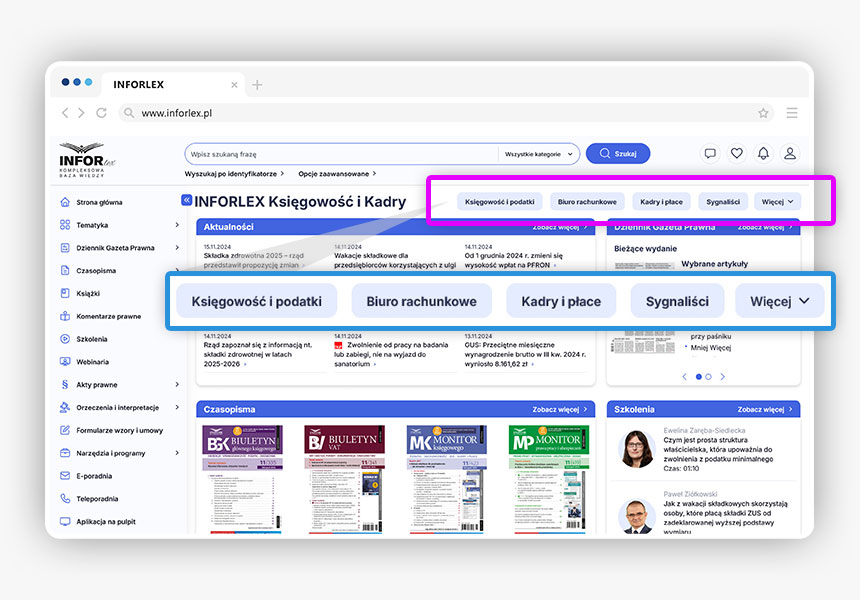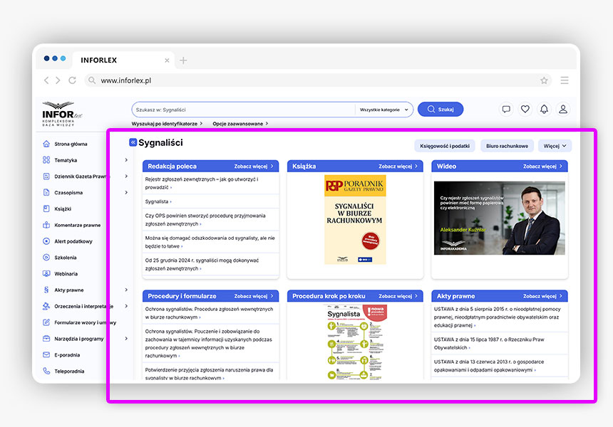 W każdym INFORLEX znajdziesz specjalnie przygotowane strefy tematyczne. Każda strefa jest osobną podstroną zawierającą materiały merytoryczne z danego tematu podzielone na kategorie. Wśród dostępnych stref znajdziesz między innymi strefy: Sygnaliści, Ksef, Biuro Rachunkowe, Samorząd, Oświata, Pomoc społeczna i wiele innych.