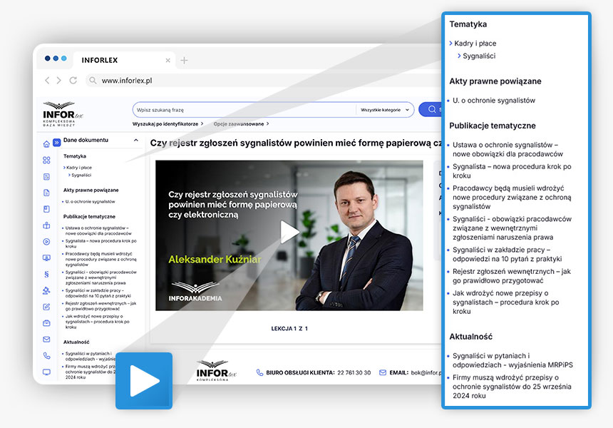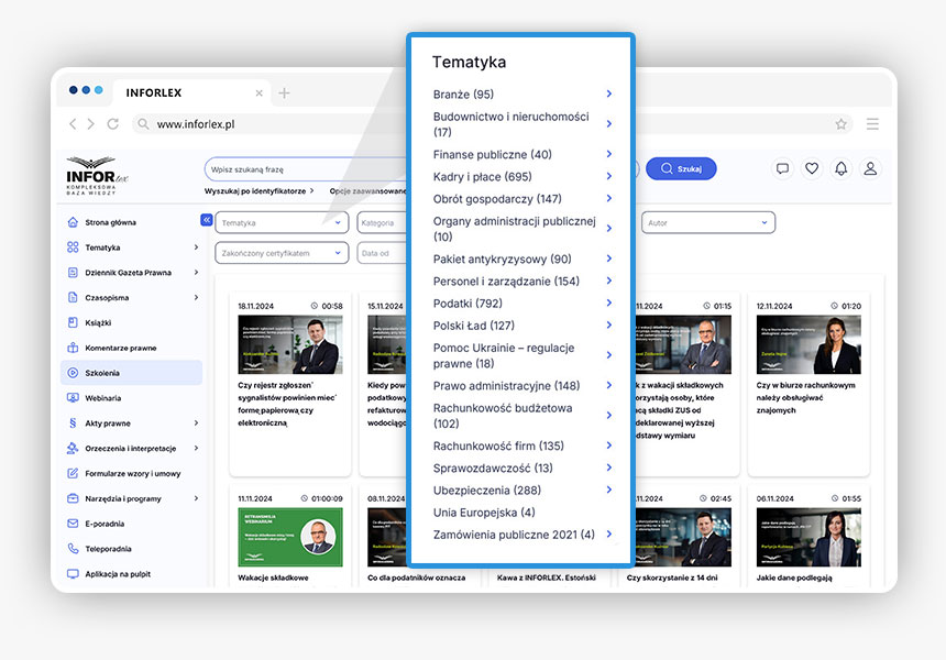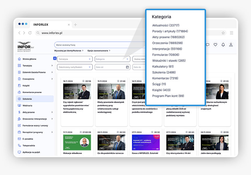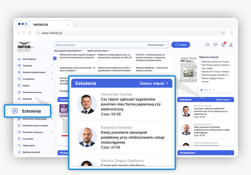 Do materiałów wideo podłączone są porady i artykuły z czasopism, aktualności, akty prawne i materiały szkoleniowe.